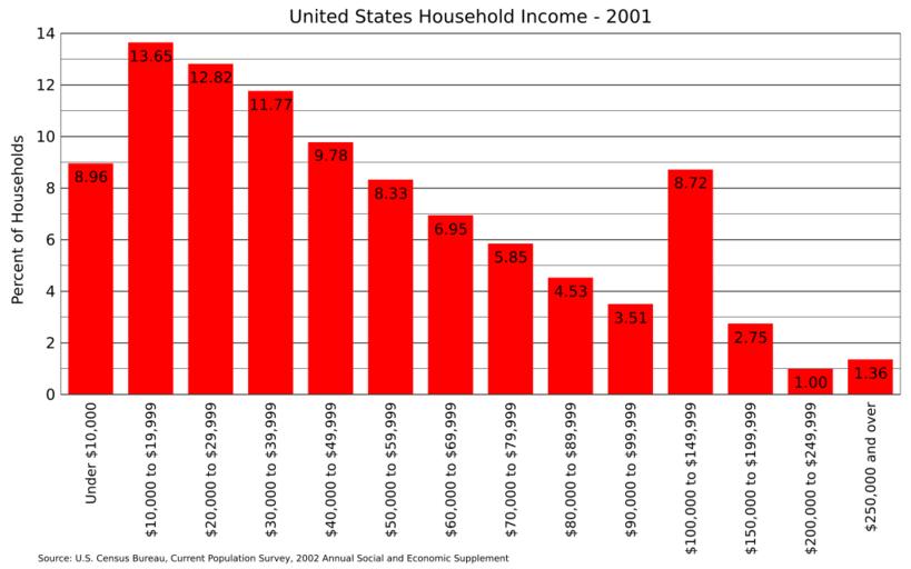 | Keywords: US household income 2001.svg en US household income distribution for 2001 Data from the https //www census gov/hhes/www/cpstables/macro/032002/hhinc/toc htm Annual Social and Economic Supplement of the CPS 2016-03-15 own Delphi234 other versions cc-zero Income distribution in the United States |