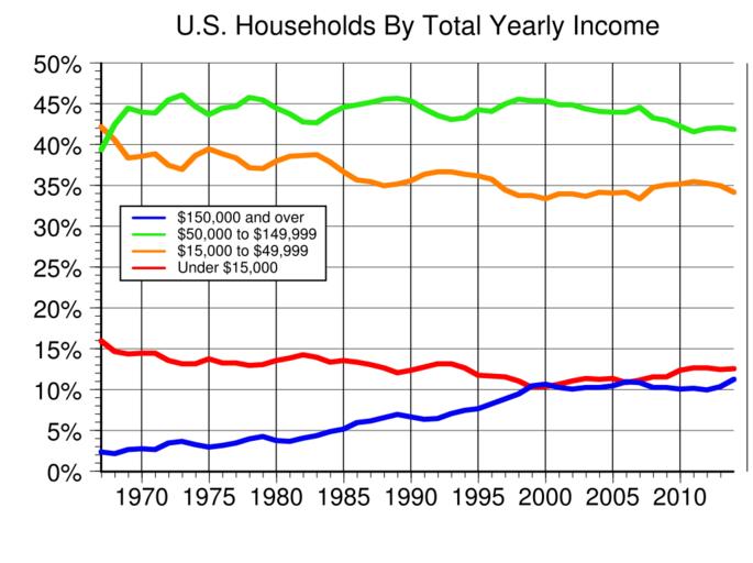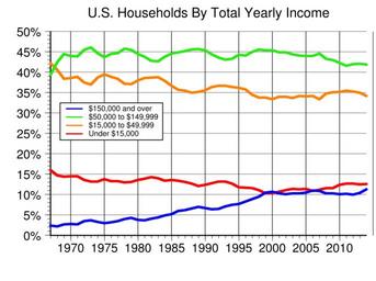 Keywords: US households by total yearly income.svg en Percentage of U S households by total yearly income in four groupings from 1967 to 2014 in constant 2014 dollars Data from U S Census Bureau https //www census gov/hhes/www/income/data/historical/household/ Table H-17 2016-03-22 own Delphi234 other versions Generated with Wikimedia SVG Chart SVG Chart/box current annually cc-zero Economic history of the United States Economic statistics for the United States Economic trends Income distribution in the United States |