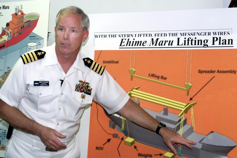 Keywords: US Navy 010822-N-1264S-001 Ehime Maru Recovery Brief.jpg en Pearl Harbor Hawaii Aug 22 2001 -- U S Navy Captain Bert Marsh explains the lifting process for the Ehime Maru Recovery Project to members of the media The Japanese Fisheries Training Vessel Ehime Maru sank in 2 000 feet of water February 9 2001 after being struck by the U S Navy nuclear attack submarine USS Greeneville SSN 772 U S Navy Photo by Photographer's Mate 3rd Class Lolita D Swain RELEASED 2001-08-22 010822-N-1264S-001 Navy http //www navy mil/view_image asp id 1163 U S Navy Photo by Photographer's Mate 3rd Class Lolita D Swain PD-USGov-Military-Navy People at Pearl Harbor Images from US Navy location Pearl Harbor Hawaii USS Greeneville SSN-772 2001 in Pearl Harbor |