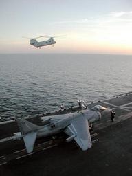 | Keywords: US Navy 020212-N-2383B-502 AV-8B.jpg en 020212-N-2383B-502 At sea aboard USS Bataan LHD 5 Feb 12 2002 -- A U S Marine Corps CH-46E Sea Knight helicopter returns aboard ship for refueling operations while an AV-8B Harrier assigned to the Blue Knights of Marine Helicopter Medium Squadron Three Six Five HMM-365 prepares for launch Bataan and elements of the 26th Marine Expeditionary Unit MEU Special Operations Capable SOC are conducting missions in support of Operation Enduring Freedom U S Navy photo by Chief Photographer's Mate Johnny Bivera RELEASED 2002-02-12 020212-N-2383B-502 Navy http //www navy mil/view_image asp id 809 U S Navy photo by Chief Photographer's Mate Johnny Bivera PD-USGov-Military-Navy Aboard USS Bataan LHD-5 AV-8B Harrier II US Marine Corps CH-46 Sea Knight February 2002 photographs |