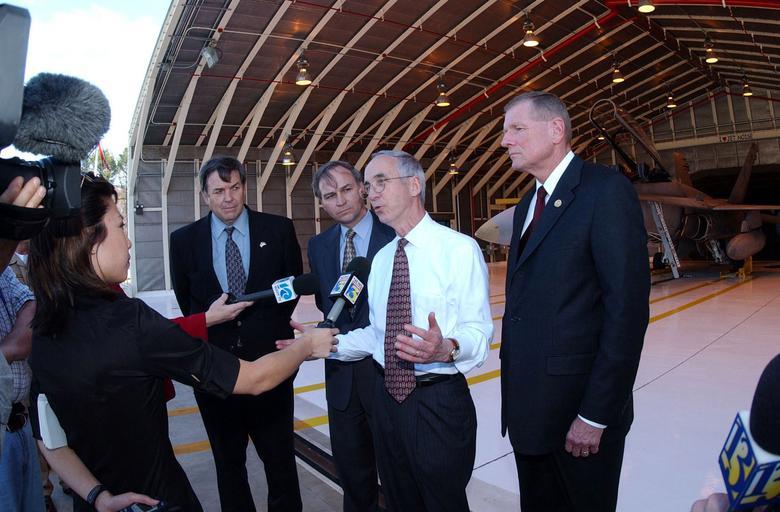 Keywords: US Navy 020315-N-5636P-003 SECNAV at NAS Oceana.jpg en Naval Air Station Oceana Virginia Beach VA Mar 15 2002 -- Secretary of the Navy The Honorable Gordon R England center accompanied by Rep Duncan Hunter R-CA far left Rep Randy Forbes R-VA center left and Rep Ed Schrock R-VA speaks with members of the press after touring a Hush House facility aboard NAS Oceana The Hush House is a noise abatement structure used by the Navy to provide a solution to the increasing number of noise complaints from area residents around the master fighter jet base at Oceana The sound-absorbing hangar is used for high-power jet engine tests conducted at the station The hangar will not be completed until May and when fully operational the sound level outside of the hanger should range at approximately 48 decibels the equivalent of everyday street traffic The Navy currently has eight other hush houses throughout the United States U S Navy photo by Chief Photographer s Mate Dolores L Parlato RELEASED 2002-03-15 020315-N-5636P-003 Navy http //www navy mil/view_image asp id 1063 U S Navy photo by Chief Photographer s Mate Dolores L Parlato PD-USGov-Military-Navy People at Naval Air Station Oceana Gordon R England Duncan Hunter Randy Forbes Ed Schrock March 2002 photographs |