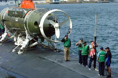 | Keywords: US Navy 020425-N-0401E-001 DSRV-1 on board USS La Jolla.jpg  en Sasebo Japan Apr 25 2002 -- The U S Navy Los Angeles attack submarine USS La Jolla SSN 701 with the deep submergence rescue vehicle Mystic DSRV-1 attached lowers the National Ensign as it prepares to get underway to participate in the submarine rescue Exercise Pacific Reach 2002 La Jolla and Mystic will operate with surface ships and submarines from the U S Japan Australia the Republic of Korea and the Republic of Singapore during Exercise Pacific Reach Mystic was specifically designed to fill the need for an improved means of rescuing the crew of a submarine immobilized on the ocean floor It can operate independently of surface conditions or under ice for rapid response to an accident anywhere in the world U S Navy photo by Journalist 3rd Class Wes Eplen RELEASED 2002-04-25 020425-N-0401E-001 Navy http //www navy mil/view_image asp id 1364 U S Navy photo by Journalist 3rd Class Wes Eplen PD-USGov-Military-Navy DSRV-1 Mystic submarine 1970 Sasebo Nagasaki USS La Jolla SSN-701 Pacific Reach 2002 April 2002 photographs April 2002 in Japan Military people in 2002 Photographs of flags of the United States Taken with Fujifilm FinePix S1 Pro Military people with a flag of the United States Salutes to flags of the United States Flag hoisting 25 April Personality rights |