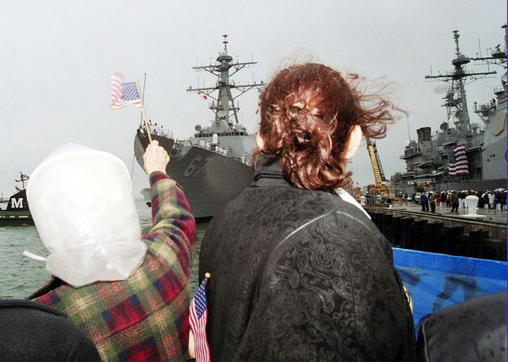 | Keywords: US Navy 020425-N-3692H-007 Family members greet USS Cole to Norfolk, VA.jpg en Naval Station Norfolk Va Apr 25 2002 -- Family and friends of the ship s crew welcome home USS Cole DDG 67 upon a return to her homeport The Cole has been at the Northrop Grumman Ship System facility in Pascagoula MS for the past 14 months undergoing repairs after a terrorist bomb blew a hole in her port side while refueling in the port city of Aden Yemen killing 17 sailors U S Navy photo by Photographer s Mate 3rd Class Stacey Hines RELEASED 2002-04-25 020425-N-3692H-007 Navy http //www navy mil/view_image asp id 1369 U S Navy photo by Photographer s Mate 3rd Class Stacey Hines PD-USGov-Military-Navy Naval Station Norfolk April 2002 photographs April 2002 in the United States April 2002 in Virginia Photographs of flags of the United States Sailors coming home 2002 in military history 25 April |