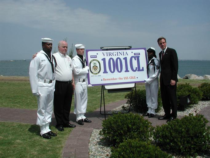 | Keywords: US Navy 020507-N-2732S-001 Norfolk NS - Cole license plate.jpg en Naval Station Norfolk VA May 7 2002 -- Virginia Gov Mark Warner far right stands with members of Navy Region Mid-Atlantic's Honor Guard and Mr Jon Clodfelter second from left father of Hull Maintenance Technician 2nd Class Kenneth Clodfelter one of the 17 Sailors killed aboard the guided-missile destroyer USS Cole DDG 67 on Oct 12 2000 while refueling in Aden Yemen Gov Warner visited the installation to sign a bill authorizing the production and sale of a commemorative license plate honoring those who lost their lives during the terrorist attack The plates will be available through the Virginia Department of Motor Vehicles later this year U S Navy photo by Journalist 3rd Class Dani Letina RELEASED 2002-05-07 020507-N-2732S-001 Navy http //www navy mil/view_image asp id 1540 U S Navy photo by Journalist 3rd Class Dani Letina PD-USGov-Military-Navy Naval Station Norfolk Hull Maintenance Technician United States Navy Mark Warner May 2002 photographs |