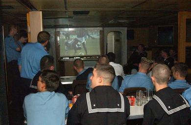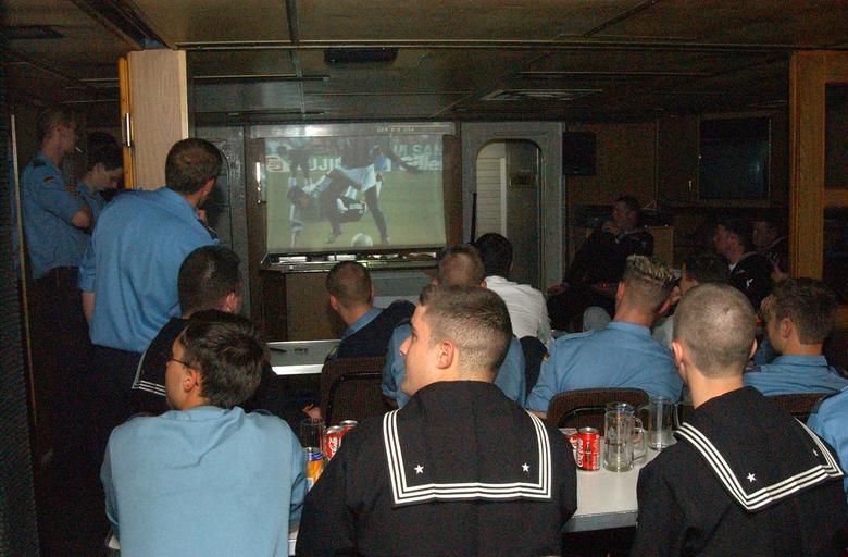 Keywords: US Navy 020621-N-0872M-504 Sailors from the guided missile cruisers USS Cape St. George (CG 71) and USS Anzio (CG 68).jpg en Kiel Germany Jun 21 2002 -- Sailors from the guided missile cruisers USS Cape St George CG 71 and USS Anzio CG 68 visit with sailors from the German Frigate Augsburg F 213 to watch the World Cup soccer match between their two respective countries Both ships are in Kiel Germany for a port visit at the conclusion of BALTOPS 2002 The United States and 11 other nations are participating in this year's exercise BALTOPS 2002 is intended to improve interoperability between allies and Partnership for Peace countries by conducting a peace support operation at sea including exercises in gunnery replenishment-at-sea undersea warfare radar tracking mine countermeasures seamanship search and rescue maritime interdiction operations and scenarios dealing with potentially real world crises U S Navy photo by Photographer's Mate 1st Class Martin E Maddock RELEASED 2002-06-21 020621-N-0872M-504 Navy http //www navy mil/view_image asp id 1759 U S Navy photo by Photographer's Mate 1st Class Martin E Maddock PD-USGov-Military-Navy Images from US Navy location Kiel Germany BALTOPS 2002 June 2002 photographs |