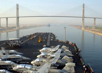 | Keywords: US Navy 020713-N-7871M-001 USS Washington transit of Suez Canal.jpg en At sea aboard USS George Washington CVN 73 Jul 13 2002 -- The Norfolk-Virginia based aircraft carrier passes through the Suez Canal and approaches the Japan-Egypt Friendship Bridge during her southern transit to the Red Sea The 820-yard 730 m -long cable-stayed bridge was constructed as part of Japan's official development aid to Egypt and was officially opened on Oct 9 2001 George Washington and her embarked Carrier Air Wing One Seven CVW-17 are on a scheduled six-month deployment conducting missions in support of Operation Enduring Freedom U S Navy photo by Photographer's Mate Airman Andrew Morrow RELEASED 2002-07-13 020713-N-7871M-001 Navy http //www navy mil/view_image asp id 1915 U S Navy photo by Photographer's Mate Airman Andrew Morrow PD-USGov-Military-Navy US Navy and Suez Canal Bridge 2002 Aboard USS George Washington CVN-73 2002 in Egypt |