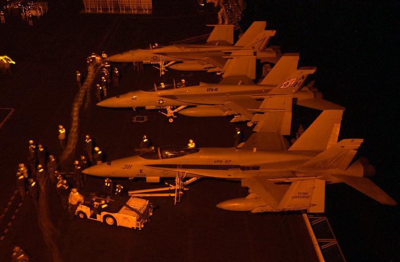Keywords: US Navy 020916-N-6213R-006 F-A-18 aircraft emarked aboard USS Nimitz prepare for night operaitons.jpg en At sea aboard USS Nimitz CVN 68 Sep 16 2002 -- F/A-18 Hornets and Super Hornets assigned to Carrier Air Wing Eleven CVW-11 are staged on the flight deck in preparation for scheduled night flight operations This is the first time Nimitz has had an air wing embarked since 1997 following an extensive yard period and homeport move from Norfolk Va to San Diego Calif Nimitz is undergoing Tailored Ships Training Availability TSTA operations Two and Three off the California coast U S Navy photo by Airman Apprentice Mark Rebilas RELEASED 2002-09-16 020916-N-6213R-006 Navy http //www navy mil/view_image asp id 2732 U S Navy photo by Airman Apprentice Mark Rebilas PD-USGov-Military-Navy Aboard USS Nimitz CVN-68 Military activities at night F/A-18 Hornet on flight decks Photographs by Mark J Rebilas |