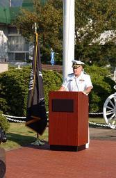 | Keywords: US Navy 020920-N-5592W-003 Commander, Fleet Activities Sasebo, delivers message at Fleet Activities Sasebo Japan.jpg en U S Fleet Activities Sasebo Japan Sep 20 2002 -- Capt Michael L James Commander Fleet Activities Sasebo delivers a message of remembrance at a ceremony held at Fleet Activities Sasebo's Godsoe Plaza in honor of POW/MIA Day during morning colors Each year on National POW/MIA Recognition Day we honor those Americans who were prisoners of war and recognize them for the courage and determination they showed in the face of unspeakable hardships We also honor those who remain unaccounted for especially remembering the sacrifices of their families who must courageously face each day without knowing the fate of their loved ones On September 20 2002 the flag of the National League of Families of American Prisoners and Missing in Southeast Asia will be flown over the White House the Capitol the Departments of State Defense and Veterans Affairs the Selective Service System Headquarters the National Vietnam Veterans Memorial the Korean War Veterans Memorial U S military installations national cemeteries and other locations across our country U S Navy Photograph by Photographer s Mate 2nd Class Andrew D Wiskow RELEASED 2002-09-20 020920-N-5592W-003 Navy http //www navy mil/view_image asp id 2758 U S Navy photo PD-USGov-Military-Navy United States Fleet Activities Sasebo National POW/MIA Recognition Day |