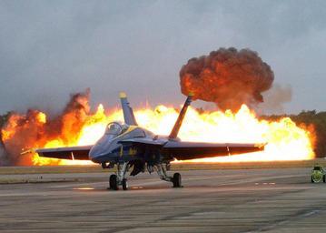 | Keywords: US Navy 021026-N-0000G-020 Wall of Fire pyrotechnic demonstration.jpg  en Naval Air Station Joint Reserve Base Belle Chasse La Oct 2 2002 -- Air Station personnel entertain the audience with the Wall of Fire pyrotechnic demonstration at the 2002 N awlins Air Show In the foreground sits one of the U S Navy s F/A-18 Hornet strike fighter aircraft belonging to the Blue Angels flight demonstration team The Blue Angels performed their aerial show later that afternoon U S Navy photo by Photographer s Mate Airman Mark Gleason RELEASED 2002-10-02 021026-N-0000G-020 Navy http //www navy mil/view_image asp id 3823 U S Navy photo by Photographer s Mate Airman Mark Gleason PD-USGov-Military-Navy N'awlins Air Show Blue Angels F/A-18 Hornet in 2002 Pyrotechnics Aircraft facing left Taken with Nikon D1X October 2002 photographs |