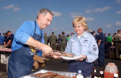 Keywords: US Navy 021027-N-4953E-003 Steel beach picnic aboard USS Truman.jpg en At sea aboard USS Harry S Truman CVN 75 Oct 27 2002 -- Dental Technician First Class Kimberley Davis from Coon Rapids Iowa enjoys a steak served by the ship s Commanding Officer Captain Michael R Groothousen Sailors enjoyed steaks donated by Thomas Anton and other distinguished visitors who recently toured the Navy's newest aircraft carrier Truman is participating in a Joint Task Force Exercise JTFEX preparing for it s upcoming scheduled six-month deployment U S Navy photo by Photographer's Mate Third Class Danny Ewing Jr RELEASED 2002-10-27 021027-N-4953E-003 Navy http //www navy mil/view_image asp id 3123 U S Navy photo by Photographer's Mate Third Class Danny Ewing Jr PD-USGov-Military-Navy Aboard USS Harry S Truman CVN-75 Steel Beach Picnics October 2002 photographs Photographs by Danny Ewing Jr Michael R Groothousen |