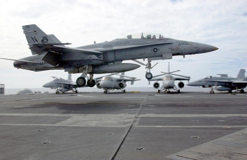 Keywords: US Navy 021102-N-7265L-003 An F-A-18 ^ldquo,Hornet^rdquo, assigned to the ^ldquo,Rough Raiders^rdquo, of Strike Fighter Squadron One Two Five (VFA-125) keeps its tailhook up during carrier flight deck training exercises.jpg en At sea with USS Carl Vinson Nov 02 2002 -- An F/A-18 Hornet assigned to the Rough Raiders of Strike Fighter Squadron 125 VFA-125 keeps its tailhook up during carrier flight deck training exercises New pilots conduct touch and goes prior to attempting a full tailhook arrested landing on the ship s flight deck VFA-125 is stationed at Naval Air Station NAS Lemoore Calif U S Navy photo by Photographer's Mate 3rd Class Inez Lawson RELEASED 2002-11-02 021102-N-7265L-003 Navy http //www navy mil/view_image asp id 3198 U S Navy photo by Photographer's Mate 3rd Class Inez Lawson PD-USGov-Military-Navy F/A-18D Hornet in flight Strike Fighter Squadron 125 United States Navy Aboard USS Carl Vinson CVN-70 F/A-18 Hornet aircraft carrier landings
