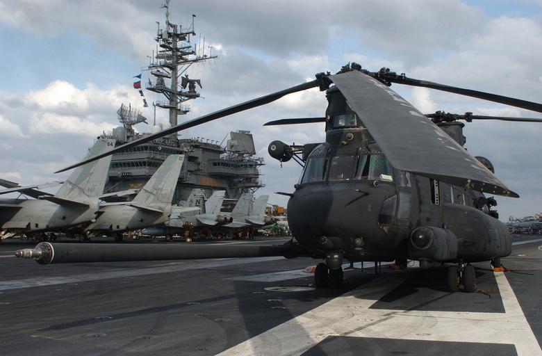 | Keywords: US Navy 021105-N-1810F-008 A U.S. Army MH-47 Chinook Special Operations helicopter deployed from Okinawa, Japan, sits chained and chocked on the flight deck aboard USS Kitty Hawk (CV 63).jpg en Pacific Ocean Nov 05 2002 A U S Army MH-47 Chinook Special Operations helicopter deployed from Okinawa Japan sits chained and chocked on the flight deck aboard USS Kitty Hawk CV 63 Army helicopters landed aboard Kitty Hawk as part of approach training and carrier qualifications with the Navy U S Navy Photo by Photographer s Mate 3rd Class Todd Frantom RELEASED 2002-11-05 021105-N-1810F-008 Navy http //www navy mil/view_image asp id 12118 U S Navy Photo by Photographer s Mate 3rd Class Todd Frantom PD-USGov-Military-Navy Aboard USS Kitty Hawk CV-63 Pictures by Mass Communication Specialist Todd Frantom MH-47 Chinook |