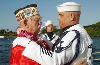 | Keywords: US Navy 021207-N-9909C-001 Attack on Pearl Harbor anniversary observance.jpg en Pearl Harbor Hawaii Dec 7 2002 -- Retired Air Force Master Sgt Richard Fiske who was the Marine Corps bugler aboard USS West Virginia when the Dec 7 1941 attack took place embraces Boatswain's Mate 1st Class James Anthony the ceremonial Boatswain s Mate for Naval Station Pearl Harbor s Honor Guard during the Dec 7th commemoration ceremony The solemn ceremony hosted by Commander Navy Region Hawaii featured Hawaii's senior Senator and Medal of Honor recipient Sen Daniel Inouye as guest speaker was held in observance of the anniversary 17 survivors of the attack on Pearl Harbor and their family members joined nearly 200 guests for the ceremony which included a wreath-laying by all branches of the U S military The Governor of Hawaii the Pearl Harbor Survivors Association and more than 20 other veteran's groups were also part of the ceremony The commemoration marks the 61st anniversary of the attack and honors the men and women who lost their lives that day U S Navy photo by Lt Cmdr Jane Campbell RELEASED 2002-12-07 021207-N-9909C-001 Navy http //www navy mil/view_image asp id 3651 U S Navy photo PD-USGov-Military-Navy People at Pearl Harbor 2002 in Pearl Harbor Images from US Navy location Pearl Harbor Hawaii Veterans of the United States |