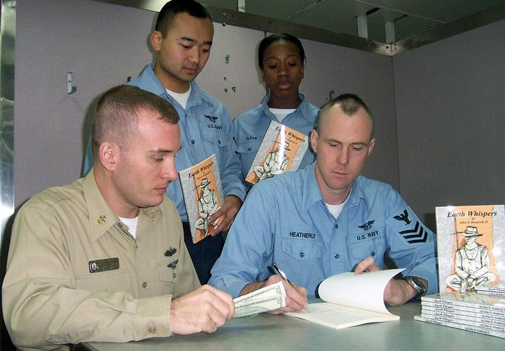 | Keywords: US Navy 021216-N-1711I-001 A trio of USS Wasp (LHD 1) sailors wait patiently to purchase an autographed copy of Aviation Structural Mechanic 1st Class John Heatherly's debut book entitled.jpg en Portsmouth Va Dec 16 2002 -- A trio of USS Wasp LHD 1 sailors wait patiently to purchase an autographed copy of Aviation Structural Mechanic 1st Class John Heatherly's debut book entitled Earth Whispers The book of poetry includes more than 100 poems offering Heatherly's views on life death love and earth Wasp is undergoing maintenance at the Norfolk Naval Shipyard U S Navy photo by Signalman 3rd Class Derrick Ingle RELEASED 2002-12-16 021216-N-1711I-001 Navy http //www navy mil/view_image asp id 3761 U S Navy photo by Signalman 3rd Class Derrick Ingle PD-USGov-Military-Navy Portsmouth Virginia Aboard USS Wasp LHD-1 |