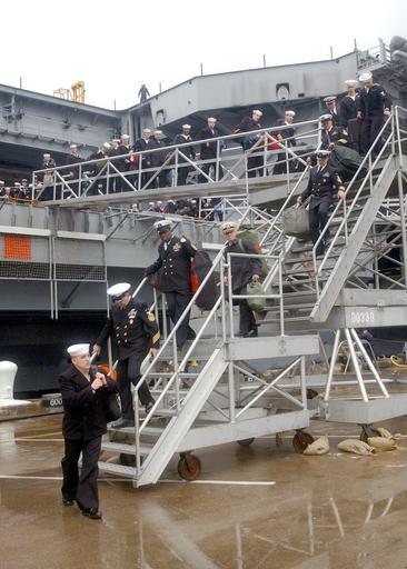 | Keywords: US Navy 021220-N-4374S-006 Sailors cross the brow.jpg en Norfolk Va Dec 20 2002 -- Sailors cross the brow as they depart USS George Washington CVN 73 at Naval Station Norfolk During the deployment George Washington launched approximately 10 000 sorties which included offensive strike missions to dislodge Taliban and Al-Qaida operatives In August George Washington and Normandy were in the Arabian Gulf in support of Operation Southern Watch enforcing the southern no-fly zone over Iraq Carrier Air Wing 17 sorties marked the first time in a year that aircraft launched from a U S carrier patrolled the skies over Iraq in conjunction with other coalition aircraft U S Navy photo by Photographer s Mate Michael Sandberg RELEASED 2002-12-20 021220-N-4374S-006 Navy http //www navy mil/view_image asp id 3805 U S Navy photo by Photographer s Mate Michael Sandberg PD-USGov-Military-Navy Naval Station Norfolk Aboard USS George Washington CVN-73 |