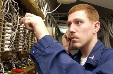 | Keywords: US Navy 021230-N-1356A-003 Electronics Technician 3rd Class Jeff Dupont assigned to the Combat Systems Division, performs maintenance on one of the ship's ^ldquo,sailor phone^rdquo, junction boxes.jpg en At sea aboard USS Constellation CV 64 Dec 30 2002 -- Electronics Technician 3rd Class Jeff Dupont assigned to the Combat Systems Division performs maintenance on one of the ship's sailor phone junction boxes Constellation is currently on a regularly scheduled six-month deployment conducting missions in support of Operation Enduring Freedom U S Navy photo by Photographer's Mate 2nd Class Charles E Alvarado RELEASED 2002-12-30 021230-N-1356A-003 Navy http //www navy mil/view_image asp id 3904 U S Navy photo by Photographer's Mate 2nd Class Charles E Alvarado PD-USGov-Military-Navy Aboard USS Constellation CV-64 Electronics Technician |