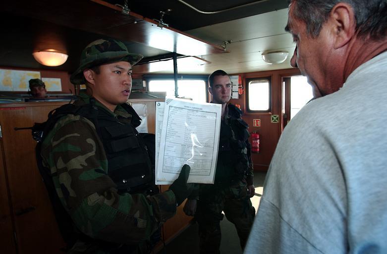 Keywords: US Navy 030112-N-3642E-004 Fire Controlman 2nd Class Enrico Tatad, assigned to the guided missile cruiser USS Valley Forge (CG 50) asks the captain of a cargo ship if there is an operating copier on board.jpg en Central Command Area of Responsibility Jan 12 2004 Fire Controlman 2nd Class Enrico Tatad assigned to the guided missile cruiser USS Valley Forge CG 50 asks the captain of a cargo ship if there is an operating copier on board Many documents are copied and brought back to USS Valley Forge for future reference Tatad is conducting a Visit Board Search and Seizure VBSS inspection Valley Forge is currently forward deployed conducting Maritime Interdiction Operations MIOs in the Central Command Area of Responsibility in support of United Nations sanctions against Iraq U S Navy photo by Photographer s Mate 1st Shawn Eklund RELEASED 2004-01-12 030112-N-3642E-004 Navy http //www navy mil/view_image asp id 11944 U S Navy photo by Photographer s Mate 1st Shawn Eklund PD-USGov-Military-Navy Fire Controlman United States Navy images from Central Command USS Valley Forge CG-50 Visit Board Search and Seizure |
