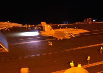 Keywords: US Navy 030115-N-4965F-501 F-A-18 Hornet makes a night catapult launch.jpg en At sea aboard USS Theodore Roosevelt CVN 71 Jan 15 2003 -- An F/A-18C Hornet assigned to the War Party of Strike Fighter Squadron Eight Seven VFA-87 launches from one of four steam driven catapults on the ship s flight deck during night time flight operations Roosevelt is currently underway conducting training missions in the Atlantic Ocean U S Navy photo by Photographer s Mate 1st Class James Foehl RELEASED 2003-01-15 030115-N-4965F-501 Navy http //www navy mil/view_image asp id 4035 U S Navy photo by Photographer s Mate 1st Class James Foehl PD-USGov-Military-Navy USS Theodore Roosevelt CVN-71 flight deck Aircraft using afterburning |
