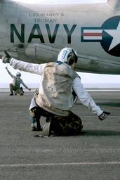 Keywords: US Navy 030116-N-9964S-002 Flight deck quality control safety observers give a ready for launch signal to flight deck aircraft handlers.jpg en At sea aboard USS Harry S Truman CVN 75 Jan 16 2003 -- Flight deck quality control safety observers give a ready for launch signal to flight deck aircraft handlers during final preparations for launch of a E-2C Hawkeye Harry S Truman and Carrier Air Wing Three CVW-3 are currently on a regularly scheduled deployment conducting missions in support of Operation Enduring Freedom U S Navy photo by Photographer s Mate 3rd Class Christopher B Stoltz RELEASED 2003-01-16 030116-N-9964S-002 Navy http //www navy mil/view_image asp id 4145 U S Navy photo by Photographer s Mate 3rd Class Christopher B Stoltz PD-USGov-Military-Navy Aboard USS Harry S Truman CVN-75 Northrop Grumman E-2C Hawkeye aircraft carrier take-offs