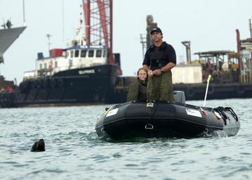 | Keywords: US Navy 030212-N-3783H-001 Zak, a 375-pound California sea lion, patrols during one of many harbor patrol training swims.jpg en Central Command Area of Responsibility Feb 12 2003 -- Zak a 375-pound California sea lion patrols during one of many harbor patrol training swims Zak is participating in the Space and Naval Warfare Systems Center s Shallow Water Intruder Detection System SWIDS program Zak has been trained to locate swimmers near piers ships and other objects in the water considered suspicious and a possible threat to military forces in the area SWIDS program has been deployed as part of the continued effort to support missions under Operation Enduring Freedom U S Navy Photograph by Photographers Mate 2nd Class Bob Houlihan RELEASED 2003-02-12 030212-N-3783H-001 Navy http //www navy mil/view_image asp id 4500 U S Navy photo PD-USGov-Military-Navy United States Navy images from Central Command United States Navy Marine Mammal Program People with animals |