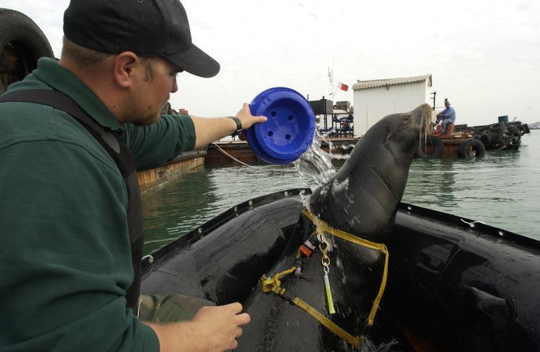 | Keywords: US Navy 030213-N-3783H-010 Zak, a 375-pound California sea lion, gets splashed with water to keep him cool while on a harbor patrol training mission.jpg en Central Command Area of Responsibility Feb 13 2003 -- Zak a 375-pound California sea lion gets splashed with water to keep him cool while on a harbor patrol training mission Zak is participating in the Space and Naval Warfare Systems Center s Shallow Water Intruder Detection System SWIDS program Zak is trained to locate swimmers and other small-sized objects considered suspicious near piers and ships which may pose a threat to military forces in the area The SWIDS program has been deployed as part of the continued effort to support missions under Operation Enduring Freedom U S Navy Photograph by Photographers Mate 2nd Class Bob Houlihan RELEASED 2003-02-13 030213-N-3783H-010 Navy http //www navy mil/view_image asp id 4555 U S Navy photo PD-USGov-Military-Navy Splashing United States Navy images from Central Command United States Navy Marine Mammal Program People with animals |