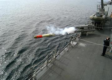 Keywords: US Navy 030223-N-8029P-002 A MK-46 torpedo launch from USS Preble DDG 88.jpg en Pacific Ocean Feb 23 2003 -- A MK-32 Mod 15 Surface Vessel Torpedo Tube SVTT fires a MK-46 Mod 5 lightweight torpedo from the port side of the recently commissioned guided missile destroyer USS Preble DDG 88 during a Combat Systems Ship Qualification Test CSSQT The MK-46 torpedo is designed to attack high performance submarines and is considered the backbone of the Navy s Anti-Submarine Warfare ASW inventory USS Preble was commissioned Nov 9 2002 and is homeported in San Diego Calif U S Navy photo by Photographer s Mate 3rd Class Ramon Preciado RELEASED 2003-02-23 030223-N-8029P-002 Navy http //www navy mil/view_image asp id 4962 U S Navy photo by Photographer s Mate 3rd Class Ramon Preciado PD-USGov-Military-Navy Mark 46 torpedo Mark 32 Surface Vessel Torpedo Tubes Aboard USS Preble DDG-88 Torpedo launching |