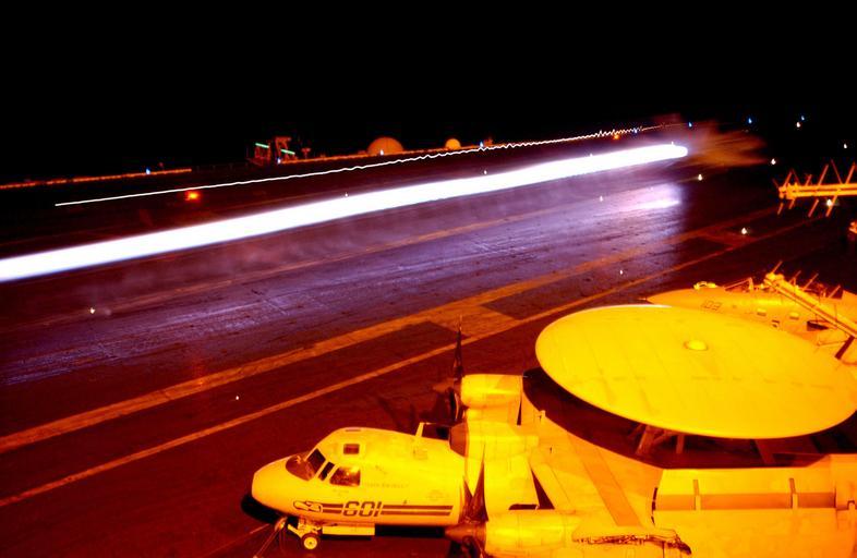 Keywords: US Navy 030302-N-4953E-003 F-A-18 night launch aboard USS Harry S. Truman CVN 75.jpg en Mediterranean Sea Mar 2 2003 -- An F/A-18 Hornet makes a night-time catapult launch from the flight deck aboard USS Harry S Truman CVN 75 Truman and her embarked Carrier Air Wing Three CVW-3 are on a regularly scheduled six-month deployment in support of Operation Enduring Freedom U S Navy photo by Photographer's Mate 3rd Class Danny Ewing Jr RELEASED 2003-03-02 030302-N-4953E-003 Navy http //www navy mil/view_image asp id 4906 U S Navy photo by Photographer's Mate 3rd Class Danny Ewing Jr PD-USGov-Military-Navy Images from US Navy location Mediterranean Sea USS Harry S Truman CVN-75 flight deck Military activities at night Aircraft light trails F/A-18 Hornet aircraft carrier launches Northrop Grumman E-2C Hawkeye on flight decks Photographs by Danny Ewing Jr |