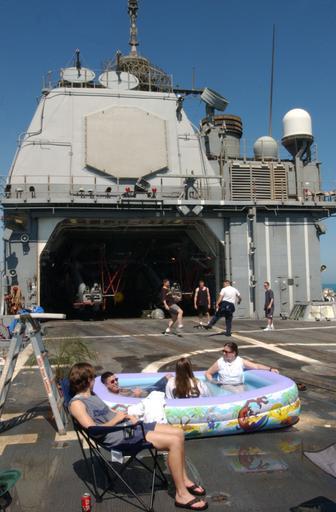 | Keywords: US Navy 030316-N-4655M-001 Crewmembers relax on the main deck of the guided missile cruiser USS Bunker Hill (CG 52).jpg en The Arabian Gulf Mar 16 2003 -- Crewmembers relax on the main deck of the guided missile cruiser USS Bunker Hill CG 52 during a Steel Beach Picnic held aboard ship Bunker Hill is currently forward deployed in the Arabian Gulf conducting missions in support of U N sanctions against Iraq and other tasks in support of Operation Enduring Freedom U S Navy photo by Photographer's Mate 2nd Class Richard Moore RELEASED 2003-03-16 030316-N-4655M-001 Navy http //www navy mil/view_image asp id 5279 U S Navy photo by Photographer's Mate 2nd Class Richard Moore PD-USGov-Military-Navy Aboard USS Bunker Hill CG-52 Steel Beach Picnics |