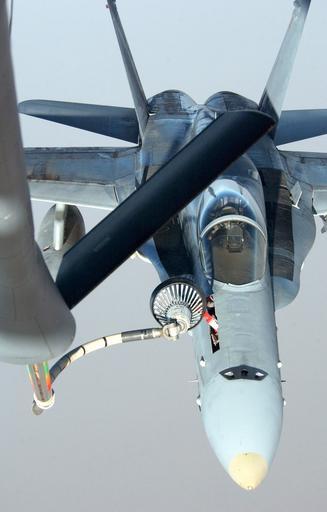 Keywords: US Navy 030321-F-7203T-004 A U.S. Navy F-A-18 Hornet takes fuel from an Air Force KC-135 Stratotanker in the skies near Iraq.jpg en Central Command Area of Responsibility Mar 21 2003 -- A U S Navy F/A-18 Hornet takes fuel from an Air Force KC-135 Stratotanker in the skies near Iraq before continuing on its mission in Support of Operation Iraqi Freedom The Hornet is primarily used as a fighter escort and fleet air defense However it can also be used as an attack aircraft with the capability of force projection interdiction as well as both close and deep air support This duel capability gives commanders immense flexibility in wartime operations Operation Iraqi Freedom is the multi-national coalition effort to liberate the Iraqi people eliminate Iraq s weapons of mass destruction and end the regime of Saddam Hussein U S Air Force Photo Courtesy of Staff Sgt Cherie A Thurlby RELEASED 2003-03-21 030321-F-7203T-004 Navy http //www navy mil/view_image asp id 5570 U S Navy photo PD-USGov-Military-Navy United States Navy images from Central Command Aerial refueling of F/A-18 Hornet Aerial refueling by KC-135 Stratotanker as seen from tanker |