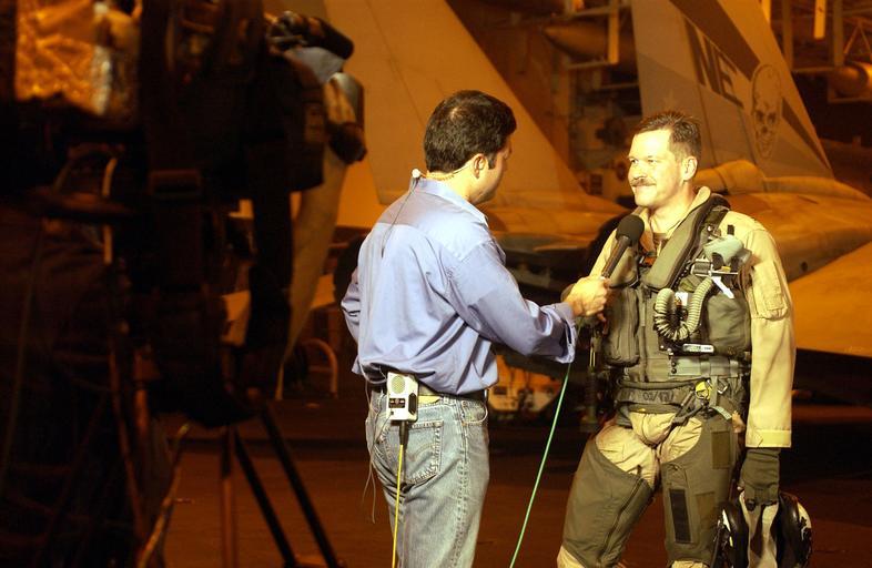 Keywords: US Navy 030322-N-1397H-001 U.S. Navy Capt. Mark Fox, Commander Carrier Air Wing Two (CVW-2), is interviewed by a CNN reporter in the ship^rsquo,s hangar bay.jpg en The Arabian Gulf Mar 21 2003 -- U S Navy Capt Mark Fox Commander Carrier Air Wing Two CVW-2 is interviewed by a CNN reporter in the ship s hangar bay aboard the aircraft carrier USS Constellation CV 64 following a mission over Iraq Just over 12 years ago on January 17 1991 while flying an F/A-18 Hornet from Strike Fighter Squadron Eight One VFA-81 assigned to the aircraft carrier USS Saratoga CV 60 Capt Fox became the first Navy pilot to shoot down a Iraqi MIG-21 at the beginning of the Operation Desert Storm Constellation and Carrier Air Wing Two CVW-2 are deployed currently conducting combat missions in support of Operation Iraqi Freedom U S Navy photo by Photographer's Mate 3rd Class Prince A Hughes III RELEASED 2003-03-21 030322-N-1397H-001 Navy http //www navy mil/view_image asp id 5522 U S Navy photo by Photographer's Mate 3rd Class Prince A Hughes III PD-USGov-Military-Navy Mark I Fox Aboard USS Constellation CV-64 CNN Interviews in the United States |