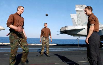 | Keywords: US Navy 030327-N-1290G-003 Plane Captains take a relax and play some "hackey-sack", on the flight deck aboard the aircraft carrier USS Harry S. Truman.jpg en The Mediterranean Sea Mar 27 2003 -- Plane Captains take a relax and play some hackey-sack on the flight deck aboard the aircraft carrier USS Harry S Truman CVN 75 during a short break in daily flight operations Truman and Carrier Air Wing Three CVW-3 are on deployment conducting combat missions in support of Operation Iraqi Freedom Operation Iraqi Freedom is the multinational coalition effort to liberate the Iraqi people eliminate Iraq's weapons of mass destruction and end the regime of Saddam Hussein U S Navy photo by Photographer's Mate Airman Carl E Gibson RELEASED 2003-03-27 030327-N-1290G-003 Navy http //www navy mil/view_image asp id 5893 U S Navy photo by Photographer's Mate Airman Carl E Gibson PD-USGov-Military-Navy USS Harry S Truman CVN-75 flight deck Hacky sack |