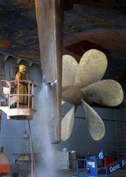 | Keywords: US Navy 030327-N-3714J-001 A contractor from National Steel and Shipping Company (NASSCO) hydro-blasts the ship^rsquo,s screws as part of a preservation program for the ship^rsquo,s hull.jpg en USS Belleau Wood LHA 3 Mar 27 2002 -- A contractor from National Steel and Shipping Company NASSCO hydro-blasts the ship s screws as part of a preservation program for the ship s hull USS Belleau Wood LHA 3 is currently in dry dock after returning from a deployment in support of Operation Enduring Freedom The 40 000-ton Navy vessel is the lead element of a three-ship Amphibious Readiness Group ARG Belleau Wood carries a crew of 1 000 Sailors and more than 2 000 Marines U S Navy photo by Photographer s Mate 3rd Class Erika Jones RELEASED 2002-03-27 030327-N-3714J-001 Navy http //www navy mil/view_image asp id 7139 U S Navy photo by Photographer s Mate 3rd Class Erika Jones PD-USGov-Military-Navy Aboard USS Belleau Wood LHA-3 Ship propellers National Steel and Shipbuilding Company Dry docks in the United States |