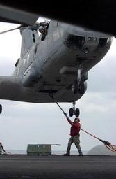 Keywords: US Navy 030328-N-7265L-005 An Aviation Ordnanceman assigned to the G-1 (Flight Deck Ordnance) division attaches cargo straps to a CH-46D Sea Knight helicopter.jpg en East China Sea Mar 28 2003 -- An Aviation Ordnanceman assigned to the G-1 Flight Deck Ordnance division attaches cargo straps to a CH-46D Sea Knight helicopter aboard USS Carl Vinson CVN 70 to be returned to the fast combat support ship USS Sacramento AOE 1 during an underway replenishment The ships passed over one million gallons of fuel and over 480 pallets of cargo during the UNREP Carl Vinson and Sacramento have completed participating in Exercise Foal Eagle and are continuing their deployment in the western Pacific Ocean Exercise Foal Eagle is an annual joint and combined field training exercise between the U S and Republic of Korea armed forces The exercise is designed to strengthen relationships and improve interoperability between both nations through real world training scenarios U S Navy photo by Photographer's Mate 2nd Class Inez Lawson RELEASED 2003-03-28 030328-N-7265L-005 Navy http //www navy mil/view_image asp id 5971 U S Navy photo by Photographer's Mate 2nd Class Inez Lawson PD-USGov-Military-Navy CH-46 helihoisting cargo Aviation Ordnanceman USS Sacramento AOE-1 |