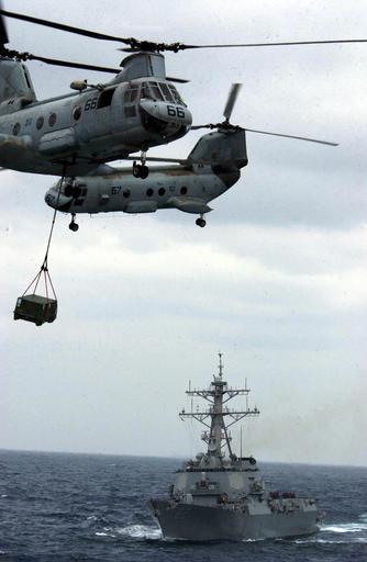 Keywords: US Navy 030328-N-7265L-023 Two CH-46D Sea Knight helicopters cross paths while transferring cargo.jpg en East China Sea Mar 28 2003 -- Two CH-46D Sea Knight helicopters assigned to the Gunbearers of Helicopter Combat Support Squadron Eleven HC-11 cross paths while transferring cargo to the flight deck of the aircraft carrier USS Carl Vinson CVN 70 during a vertical replenishment with the fast combat support ship USS Sacramento AOE 1 as the guided missile destroyer USS Lassen DDG 82 steams behind The ships passed over one million gallons of fuel and over 480 pallets of cargo during the UNREP Carl Vinson and Sacramento have just completed participating in Exercise Foal Eagle and are continuing their deployment in the western Pacific Ocean Exercise Foal Eagle is an annual joint and combined field training exercise between the U S and Republic of Korea armed forces The exercise is designed to strengthen relationships and improve interoperability between both nations through real world training scenarios U S Navy photo by Photographer's Mate 2nd Class Inez Lawson RELEASED 2003-03-28 030328-N-7265L-023 Navy http //www navy mil/view_image asp id 5973 U S Navy photo by Photographer's Mate 2nd Class Inez Lawson PD-USGov-Military-Navy CH-46 helihoisting cargo USS Lassen DDG-82 CH-46D Sea Knight Images from US Navy location East China Sea Helicopter Combat Support Squadron 11 United States Navy |