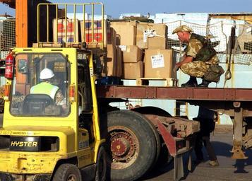 Keywords: US Navy 030328-N-2513W-068 Humanitarian Assistance (HA) supplies are placed on a flatbed truck by a forklift delivery to the Iraqi people by Coalition forces at the port of Umm Qasr.jpg en Umm Qasr Iraq Mar 28 2003 -- Humanitarian Assistance HA supplies are placed on a flatbed truck by a forklift delivery to the Iraqi people by Coalition forces at the port of Umm Qasr Coalition forces are providing support for the off-loading of the Royal Fleet Auxiliary Landing Ship Logistic RFA Sir Galahad L 3005 The British ship is the first vessel to deliver Humanitarian Assistance HA supplies to the Coalition secured port Operation Iraqi Freedom is the multinational coalition effort to liberate the Iraqi people eliminate Iraq's weapons of mass destruction and end the regime of Saddam Hussein U S Navy Photograph by Photographer s Mate 1st Class Ronald V Woxland RELEASED 2003-03-28 030328-N-2513W-068 Navy http //www navy mil/view_image asp id 5993 U S Navy photo PD-USGov-Military-Navy Umm Qasr in the Iraq War Military logistics in the Iraq War |