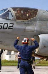 | Keywords: US Navy 030409-N-4843P-003 During pre-flight checks, an EA-6B Prowler plane captain communicates to the aircrew to remove their hands from all controls as arming pins are removed.jpg en Kadena Air Base Okinawa Japan Apr 9 2003 -- During pre-flight checks an EA-6B Prowler plane captain Aviation Ordnanceman 1st Class Pepper Ringenberg assigned to the Yellow Jackets of Electronic Attack Squadron One Thirty Eight VAQ-138 communicates to the aircrew to remove their hands from all controls as arming pins are removed VAQ-138 is currently embarked aboard USS Carl Vinson CVN 70 with Carrier Air Wing Nine CVW-9 on deployment in the western Pacific Ocean conducting missions in support of Operation Enduring Freedom U S Navy photo by Photographer's Mate 2nd Class Anthony Pugliani RELEASED 2003-04-09 030409-N-4843P-003 Navy http //www navy mil/view_image asp id 6540 U S Navy photo by Photographer's Mate 2nd Class Anthony Pugliani PD-USGov-Military-Navy Kadena Air Base Grumman EA-6 Prowler Pre-flight checks US Navy Electronic Attack Squadron 138 United States Navy |