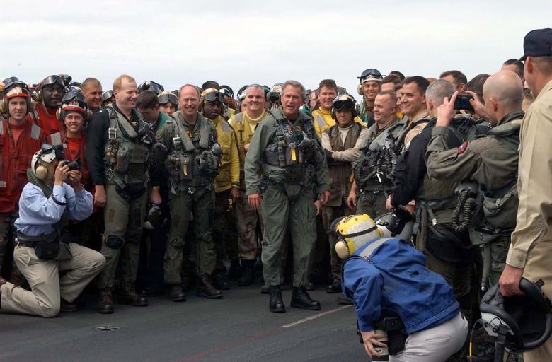 MAKE A MEME View Large Image Navy 030501-N-8479H-020 President George W. Bush greets sailors on the flight deck after a successful trap aboard the USS Abraham Lincoln (CVN 72).jpg en Pacific Ocean May 1 2003 -- President George W Bush greets sailors on the flight deck ...