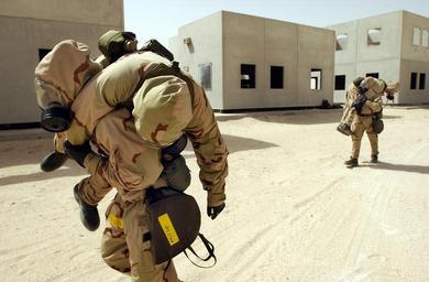 Keywords: US Navy 030520-N-4309A-046 Members of Naval Support Activity (NSA) Bahrain's Emergency Response Team participate in an improvised carry.jpg en Naval Support Activity NSA Bahrain May 20 2003 -- Members of Naval Support Activity NSA Bahrain's Emergency Response Team participate in an improvised carry which is one of the various ways of evacuating wounded personnel The NSA Bahrain Emergency Response Team recently met at a remote training facility to practice their skills on Chemical Biological Radiological defense response and recovery procedures U S Navy photo by Photographer s Mate 1st Class Aaron Ansarov RELEASED 030520-N-4309A-046 Navy http //www navy mil/view_image asp id 7627 U S Navy photo by Photographer s Mate 1st Class Aaron Ansarov PD-USGov-Military-Navy Naval Support Activity Bahrain Military protective clothing Military training in the United States Fireman's carry MCU-2/P Protective Mask Males wearing gas masks |