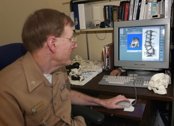 Keywords: US Navy 030819-N-9593R-172 Captain (Medical Corps) Charles Richardson studies a three-dimensional model on his work station at the National Naval Medical Center in Bethesda, Maryland.jpg en National Naval Medical Center Bethesda Md Aug 19 2003 -- Captain Charles Richardson MC Medical Corps studies a three-dimensional model on his work station at the National Naval Medical Center in Bethesda Maryland The hospital uses 3D modeling based on radiological images then converts the computer model to a device prior to surgery This can minimize a corrective surgery that may take four hours to complete down to approximately one hour according to medical personnel U S Navy photo by Chief Warrant Officer 4 Seth Rossman RELEASED 2003-08-19 030819-N-9593R-172 Navy http //www navy mil/view_image asp id 9784 U S Navy photo by Chief Warrant Officer 4 Seth Rossman PD-USGov-Military-Navy National Naval Medical Center |