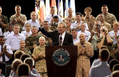 Keywords: US Navy 030825-F-2828D-115 Secretary of Defense Donald H. Rumsfeld waves to members of the audience after being introduced during a town hall meeting at Lackland Air Force Base, San Antonio, Texas.jpg en San Antonio Texas Aug 25 2003 -- Secretary of Defense Donald H Rumsfeld waves to members of the audience after being introduced during a town hall meeting at Lackland Air Force Base San Antonio Texas Rumsfeld delivered his opening remarks then fielded questions from military and civilian attendees The forum allowed people from San Antonio area bases to direct their questions to the top man at the Defense Department DoD photo by Tech Sgt Andy Dunaway RELEASED 2003-08-25 030825-F-2828D-115 Navy http //www navy mil/view_image asp id 9203 U S Navy photo PD-USGov-Military-Navy Images from US Navy location SAN ANTONIO Texas Donald Rumsfeld in 2003 |