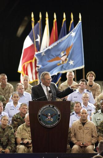 Keywords: US Navy 030825-F-2828D-286 Secretary of Defense Donald H. Rumsfeld gestures to make a point as he answers a question from a member of the audience during a town hall meeting at Lackland Air Force Base, San Antonio.jpg en San Antonio Texas Aug 25 2003 -- Secretary of Defense Donald H Rumsfeld gestures to make a point as he answers a question from a member of the audience during a town hall meeting at Lackland Air Force Base San Antonio Rumsfeld delivered his opening remarks then fielded questions from military and civilian attendees Many of the service men and women behind Rumsfeld are veterans of Operation Enduring Freedom and Operation Iraqi Freedom DoD photo by Tech Sgt Andy Dunaway RELEASED 2003-08-25 030825-F-2828D-286 Navy http //www navy mil/view_image asp id 9204 U S Navy photo PD-USGov-Military-Navy Images from US Navy location SAN ANTONIO Texas Donald Rumsfeld in 2003 Personal flags of the United States Department of Defense |