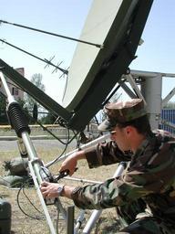 | Keywords: US Navy 030909-N-5060D-003 Electronics Technician 2nd Class Kristian Dillemuth, assigned to Joint Mobile Ashore Support Terminal (JMAST) Europe, calibrates the stabilizers of a Super High Frequency satellite dish.jpg en Tblisi Georgia Sep 9 2003 -- Electronics Technician 2nd Class Kristian Dillemuth assigned to Joint Mobile Ashore Support Terminal JMAST Europe calibrates the stabilizers of a Super High Frequency satellite dish The dish provides a signal for Internet phones and video teleconferencing The JMAST team deployed to set-up computer and communication systems for the Rescuer/Medceur '03 Partnership for Peace exercise near Tbilisi JMAST is a self-contained mobile command control communications computer and intelligence C4I center designed to support the Naval component commander in joint operations JMAST offers commanders secure communications Internet telephone television and radio services while in the field U S Navy photo by Journalist 2nd Class Lily Daniels RELEASED 2003-09-09 030909-N-5060D-003 Navy http //www navy mil/view_image asp id 11482 U S Navy photo by Journalist 2nd Class Lily Daniels PD-USGov-Military-Navy Images from US Navy location Tbilisi Georgia Electronics Technician |