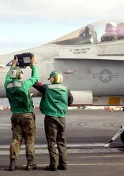 | Keywords: US Navy 031101-N-7732W-098 Flight deck personnel display an aircraft weight board to the pilot of an F-A-18C Hornet assigned to the Stingers of Strike Fighter Squadron One One Three (VFA-113) on the flight deck aboard USS John.jpg en Pacific Ocean Nov 1 2003 -- Flight deck personnel display an aircraft weight board to the pilot of an F/A-18C Hornet assigned to the Stingers of Strike Fighter Squadron One One Three VFA-113 on the flight deck aboard USS John C Stennis CVN 74 Stennis and Carrier Air Wing Fourteen CVW-14 are at sea conducting Composite Training Unit Exercise COMPTUEX in preparation for an upcoming deployment U S Navy photo by Photographer's Mate Airman Charles D Whetstine RELEASED 2003-11-01 031101-N-7732W-098 Navy http //www navy mil/view_image asp id 10365 U S Navy photo by Photographer's Mate Airman Charles D Whetstine PD-USGov-Military-Navy Aboard USS John C Stennis CVN-74 Aircraft windshields Strike Fighter Squadron 113 United States Navy |