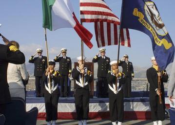 Keywords: US Navy 031104-N-3168W-026 Guests and participants of the Commander Sixth Fleet and Striking and Support Forces South change of command salute as the colors are paraded.jpg en Gaeta Italy Nov 4 2003 -- Guests and participants of the Commander Sixth Fleet and Striking and Support Forces South change of command salute as the colors are paraded during a ceremony held aboard the Raleigh Class command ship USS La Salle AGF 3 The Italian U S and U S Navy flags were saluted as the Sixth Fleet band played the Italian and U S national anthems U S Navy photo by Journalist 3rd Class Megan M Williams RELEASED 2003-11-04 031104-N-3168W-026 Navy http //www navy mil/view_image asp id 10412 U S Navy photo by Journalist 3rd Class Megan M Williams PD-USGov-Military-Navy Personality rights Aboard USS La Salle AGF-3 Change of command Color guards of the United States Navy Military people with a flag of the United States Naval Support Activity Naples Detachment Gaeta November 2003 in Italy Photographs of military flags of the United States |