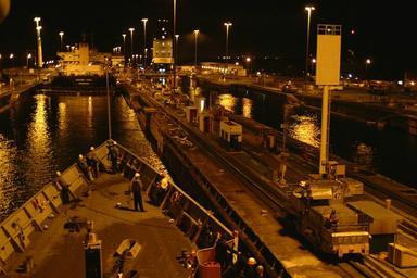Keywords: US Navy 031203-N-8740M-005 The guided missile frigate USS Stephen W. Groves (FFG 29) is pulled through the Panama Canal by steel mooring attached to a powerful electric locomotive, called a mule.jpg en Panama Canal Dec 3 2003 -- The guided missile frigate USS Stephen W Groves FFG 29 is pulled through the Panama Canal by steel mooring attached to a powerful electric locomotive called a mule lower right The entire trip through the canal takes between 8 and 10 hours plus waiting time Construction of the canal began in 1906 with a projected schedule of ten years but was finished in 1914 ahead of schedule with over 75 000 men working on the project The United States had control of the Panama Canal Zone until 1999 when the U S government turned control of the Canal Zone over to Panama Prior to the Panama Canal's construction the fastest way to travel by ship from New York to California was a long and dangerous route around the tip of South America U S Navy photo by Journalist Seamen John Hastings McIver RELEASED 2003-12-03 031203-N-8740M-005 Navy http //www navy mil/view_image asp id 11310 U S Navy photo by Journalist Seamen John Hastings McIver PD-USGov-Military-Navy United States Navy on the Panama Canal USS Stephen W Groves FFG-29 |