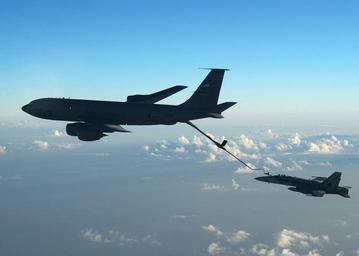 | Keywords: US Navy 031217-N-3799S-003 An F-A-18 Hornet assigned to the Marauders of Strike Fighter Squadron Eight Two (VFA-82) refuels with an U.S. Air Force KC- 135R Fuel Tanker.jpg en Arabian Gulf Dec 14 2003 -- An F/A-18C Hornet assigned to the Marauders of Strike Fighter Squadron 82 VFA-82 refuels with a U S Air Force Boeing KC-135R Stratotanker from the 380th Aerial Refueling Wing VFA-82 is currently deployed with Carrier Air-wing One CVW-1 on board USS Enterprise CVN-65 U S Navy photo by Lt j g Perry Solomon RELEASED 2003-12-14 031217-N-3799S-003 Navy http //www navy mil/view_image asp id 11131 U S Navy photo by Lt j g Perry Solomon PD-USGov-Military-Navy Aerial refueling of F/A-18C Hornet KC-135R Stratotanker Strike Fighter Squadron 82 United States Navy Aerial refueling of F/A-18 Hornet |