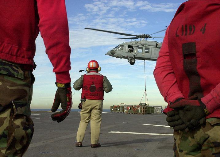 Keywords: US Navy 040106-N-8977L-011 Aviation Ordnancemen wait to retrieve crates of ammunition on the flight deck.jpg en Atlantic Ocean Jan 6 2004 Aviation Ordnancemen wait to retrieve crates of ammunition on the flight deck aboard the amphibious assault ship USS Boxer LHD 4 during a weapons on-load off the coast of Camp Pendleton N C The ammunition is being delivered by an MH-60S Knighthawk helicopter Boxer departed for the Arabian Gulf on Jan 14 2004 as part of Operation Iraqi Freedom rotation of forces after returning from a regularly scheduled deployment in August 2003 The multi-purpose amphibious assault ship and its more than 900 Sailors and 200 Marines are transporting equipment and aviation assets for the 1st Marine Expeditionary Force 1st MEF from Camp Pendleton Calif U S Navy photo by Photographer's Mate 3rd Class Johansen Laurel RELEASED 2004-01-06 040106-N-8977L-011 Navy http //www navy mil/view_image asp id 11574 U S Navy photo by Photographer's Mate 3rd Class Johansen Laurel PD-USGov-Military-Navy Aboard USS Boxer LHD-4 Aviation Ordnanceman Photos taken with Nikon D1 |