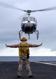Keywords: US Navy 040128-N-3241H-018 Chief Aviation Boatswain's Mate Glenn Harrison guides a commercial aerial filming helicopter safely to the flight deck aboard USS Carl Vinson (CVN 70).jpg en Pacific Ocean Jan 28 2004 - Chief Aviation Boatswain's Mate Glenn Harrison guides a commercial aerial filming helicopter safely to the flight deck aboard USS Carl Vinson CVN 70 The helicopter will be used during filming of the upcoming motion picture Stealth The Bremerton Washington based aircraft carrier is currently underway for the first time since returning from an eight and half month Western Pacific deployment Carl Vinson is conducting training with Carrier Air Wing Nine CVW-9 and other units assigned to the Carl Vinson Carrier Strike Group CSG U S Navy photo by Photographer's Mate Third Class Dustin Howell RELEASED 2004-01-28 040128-N-3241H-018 Navy http //www navy mil/view_image asp id 11642 U S Navy photo by Photographer's Mate Third Class Dustin Howell PD-USGov-Military-Navy Aviation Boatswain's Mates Handlers Aboard USS Carl Vinson CVN-70 |