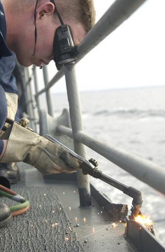 Keywords: US Navy 040128-N-9288T-109 Hull Maintenance Technician Fireman Greg Meadows, from Louisville, Ky., uses a cutting tool on the fantail.jpg en Pacific Ocean Jan 28 2004 Hull Maintenance Technician Fireman Greg Meadows from Louisville Ky uses a cutting tool on the fantail of the guided missile cruiser USS Vincennes CG 49 Vincennes is participating in Tailored Ship Training Availability TSTA I TSTA I provides an opportunity for the ship and Afloat Training Group Western Pacific to conduct hands-on training in all major mission areas U S Navy photo by Photographer's Mate 2nd Class Brandon A Teeples RELEASED 2004-01-28 040128-N-9288T-109 Navy http //www navy mil/view_image asp id 11672 U S Navy photo by Photographer's Mate 2nd Class Brandon A Teeples PD-USGov-Military-Navy Aboard USS Vincennes CG-49 Hull Maintenance Technician United States Navy |