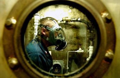 Keywords: US Navy 040211-N-9769P-080 During a Chemical, Biological, and Radiological (CBR) drill, Damage Controlman 2nd Class Jim Castillo simulates being contaminated and is sprayed with salt water in one of USS John C. Stennis's (CVN 7.jpg en Pacific Ocean Feb 11 2004 - During a Chemical Biological and Radiological CBR drill Damage Controlman 2nd Class Jim Castillo simulates being contaminated and is sprayed with salt water in one of USS John C Stennis's CVN 74 decontamination shower rooms to clean suspected chemical agents off his body Regular CBR drills are essential training for all crewmembers The San Diego-based aircraft carrier is at sea conducting training exercises in the Southern California operating area U S Navy photo by Photographer's Mate 2nd Class Jayme Pastoric RELEASED 2004-02-11 040211-N-9769P-080 Navy http //www navy mil/view_image asp id 11911 U S Navy photo by Photographer's Mate 2nd Class Jayme Pastoric PD-USGov-Military-Navy Aboard USS John C Stennis CVN-74 Damage Controlman Decontamination MCU-2/P Protective Mask Males wearing gas masks |